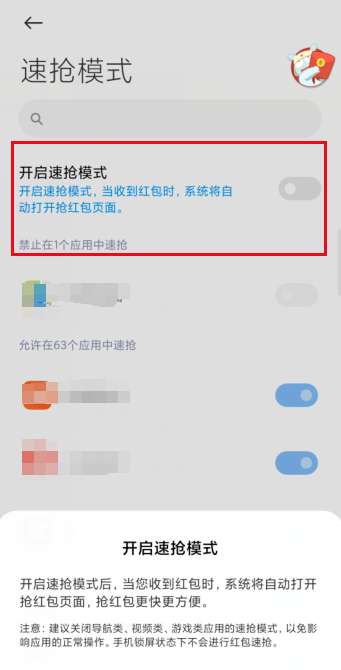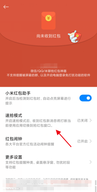 点击开启速抢模式,一旦收到红包,系统就会自动打开抢红包页面,让你抢红包。