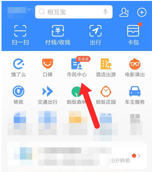 打开手机支付宝,进入界面,如图,点击【市民中心】选项,
