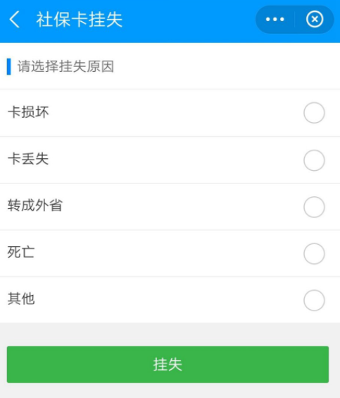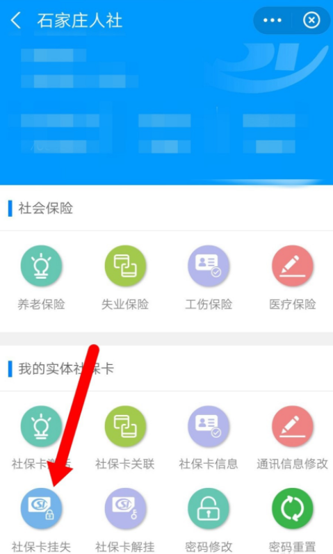 如图,点击【社保卡挂失】服务,选择挂失原因,点击【挂失】即可。