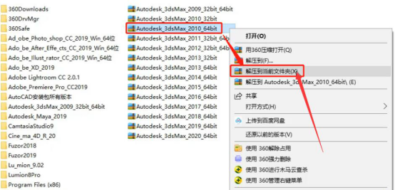 1.首先,用户可以在本站下载3dmax2010。下载后根据自己电脑的配置选择32位还是64位。右键单击3dmax2010压缩包,并点击“解压到当前文件夹”。