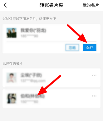 打开转账名片夹,如图,如果你还没有保存朋友名片,可以点击【保存】,如果已保存,可以直接点击好友名片,