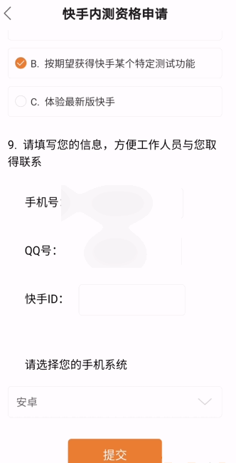 进入快手内测资格申请窗口,填写相关信息,点击【提交】,等待官方审核即可。