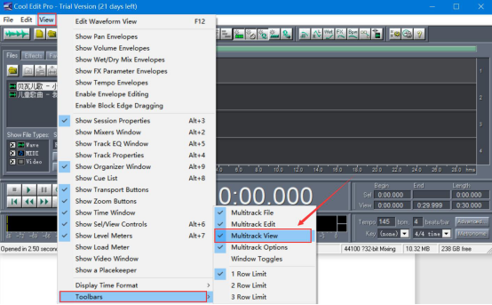 3.接下来,点击“View”菜单中的“Toolbars”,再点击其子菜单中的“Multitrack view”。