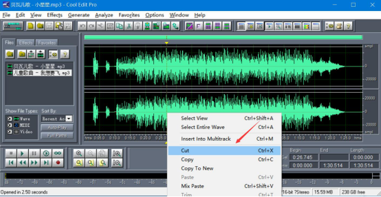 6.接着,我们开始处理cool edit pro导入的音乐片段,先根据自己的需要,右键单击要合并的音乐片段,并在右键菜单中点击“Cut”。