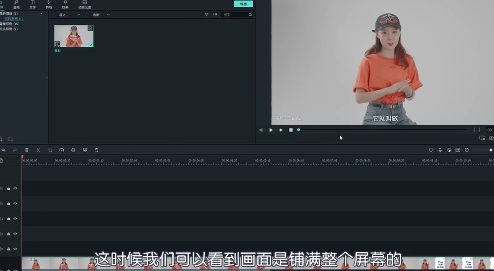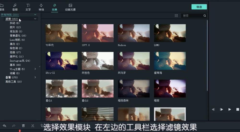 点击【效果】模块,你可以给视频添加滤镜效果,将滤镜效果下拉到轨道,即可进行预览,