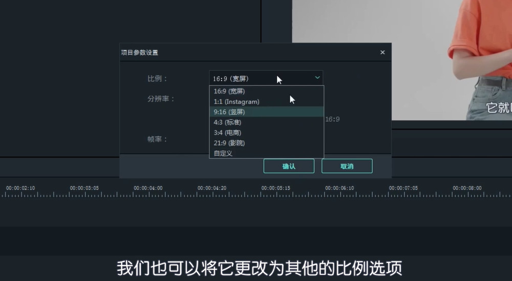 在视频预览窗口下方点击屏幕设置按钮,选择【改变工程比例】,选择【9:16】的竖屏模式,点击确认,