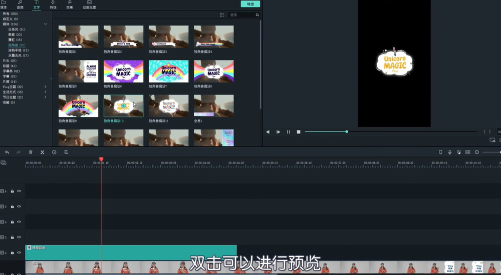 点击【文字】模块,你可以给视频添加标题,双击标题即可进行预览,然后选择自己喜欢的标题,将其拖拽到轨道,