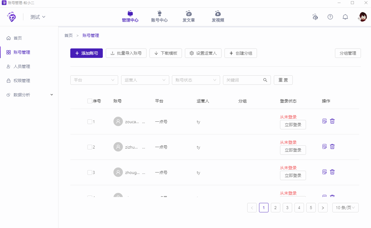 账号添加完成,点击【立即登录】,出现弹框,点击登录即可,登录状态将变更为【登录成功】;同时你还可对账号进行【设置运营人】或【创建分组】等管理。