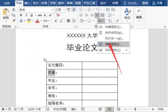 2.然后,在表格的第1列输入文本内容。选中2个字的单元格内容,依次点击“开始”菜单中的“段落”、“中文版式”、“调整宽度”,如下图所示。