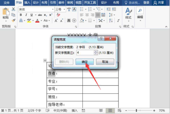 3.此时,word会弹出如下图的窗口,我们将文字宽度设置为4个字符,再点击“确定”按钮。