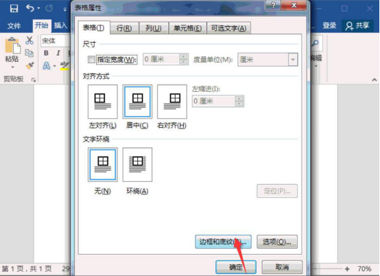 5.弹出表格属性窗口,点击“边框和底纹”按钮,从而继续下一步操作。
