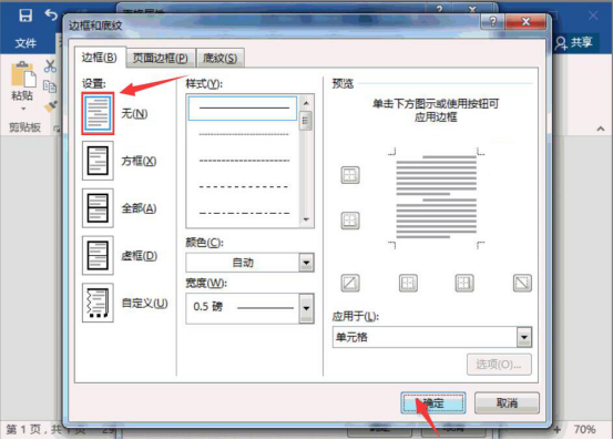 6.在边框和底纹的窗口中,我们将边框设置为“无”,再点击“确定”按钮。