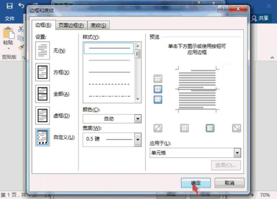 8.进入边框和底纹窗口,取消边框的上面和右边的边框线,点击“确定”按钮。这样一来,就形成了word下划线效果。