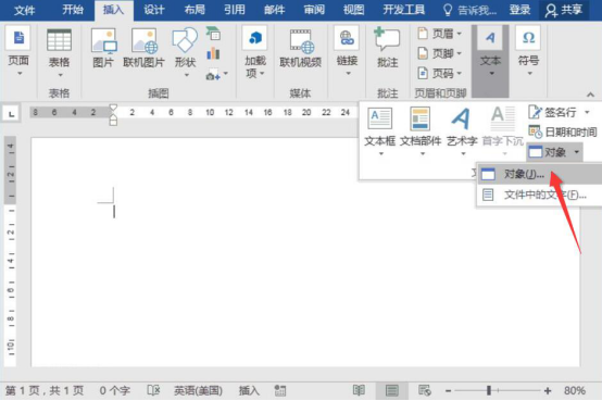 1.首先,我们打开word文档,依次点击“插入”菜单中的“文本”、“对象”、“对象”。