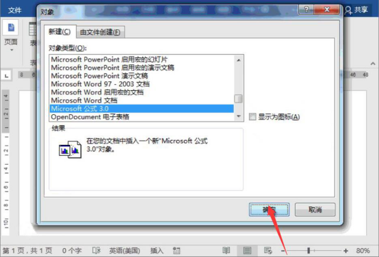 2.此时,word弹出“对象”窗口,我们点选“Microsoft公式3.0”这一对象类型,并点击“确定”按钮。