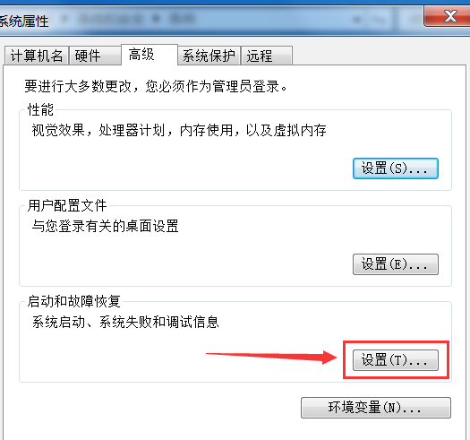 4.接着,在“系统属性”窗口“高级”选项卡页面上,点击“启动和故障恢复”下的“设置”按钮。