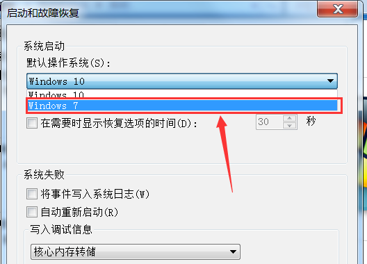 5.打开“启动和故障恢复”窗口后,点击系统启动默认操作系统下方的下拉框。