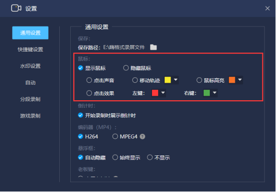 5.在用嗨格式录屏大师录制视频时,还有个实用小技巧,便是我们可以设置鼠标,比如说将鼠标设置为高亮显示,这样录制电脑操作时会更清楚。