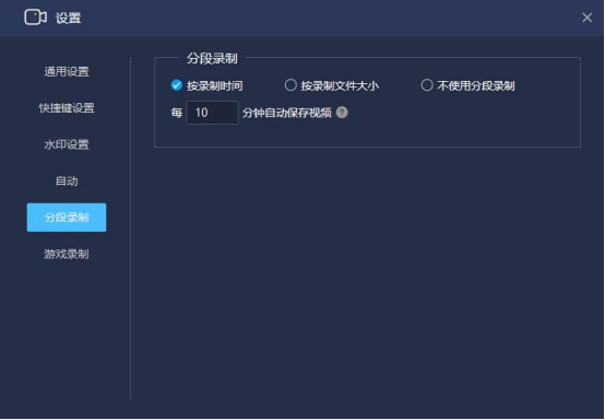 8.如果录屏时间比较长,那么文件会很大。这里就注意下它的技巧,我们切换至“分段录制”页面,按录制时间来自动保存视频,或者设置录制文件的大小。这样视频文件就不会太大了。