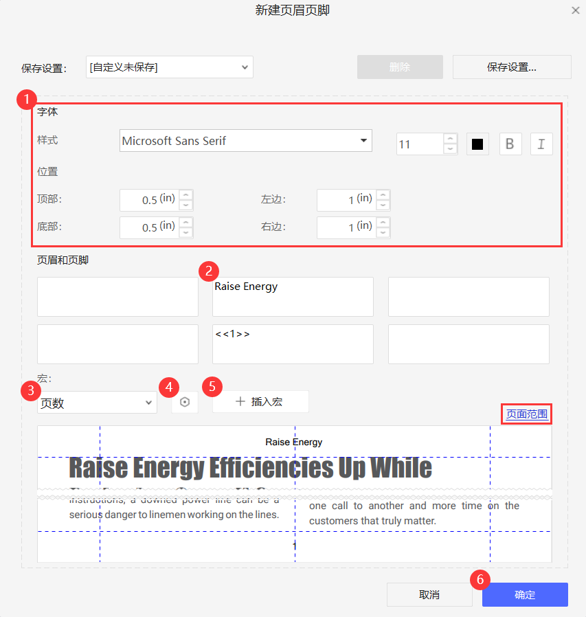 进入窗口,如图,你可以修改页眉页脚字体和页眉页脚相对页面边缘的位置,另外,你还可以通过宏添加页码或日期,先将光标放在想要添加页码或日期的文本框,之后点击下图3处,选择插入【页数】或【日期】,点击4处的齿轮按钮,选择日期格式或页码格式,最后点击5处的【插入宏】按钮,即可完成页码或日期的添加。