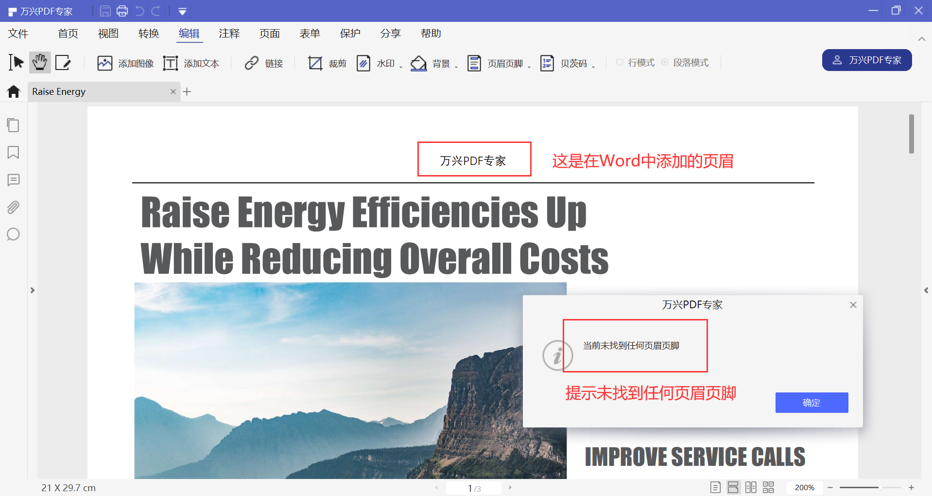 如果你想要删除页眉页脚,仅支持删除通过万兴PDF专家添加的页眉页脚;如果是由Word转化成PDF,就不能点击【编辑】——【编辑页眉页脚】——【删除页眉页脚】,否则就会出现下图的尴尬情况。
