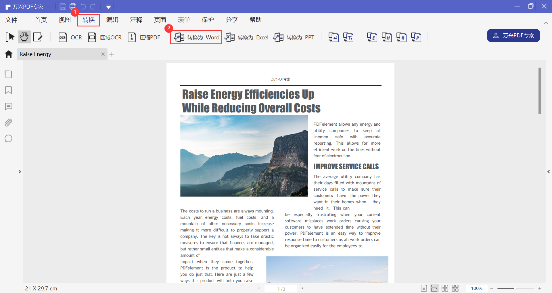 这时候需要将PDF文档转化为Word,点击【转换】——【转化为Word】,输出的Word文档就可以利用MS Office、WPS Office等软件来编辑页眉页脚。