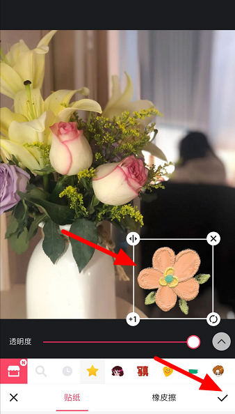 调整贴纸位置、大小,点击√,另外,你还可以在图片中进行其他操作,比如添加滤镜、文字,