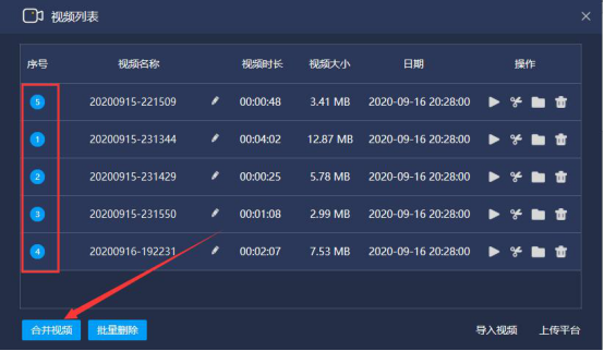 5.接下来,我们对需要合并的视频片段进行排序,再点击“合并视频”按钮。