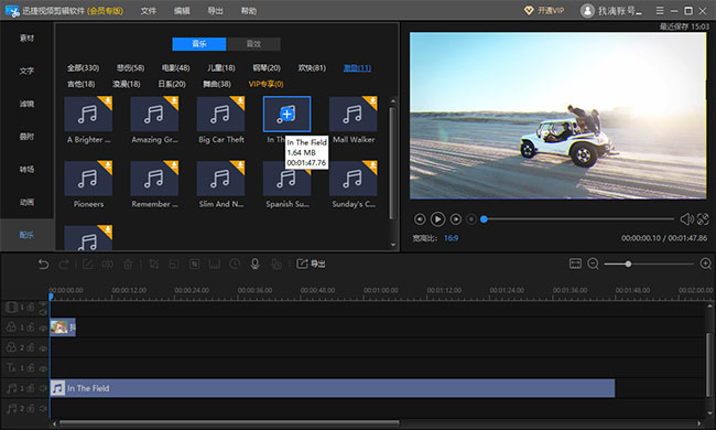 本教程中小编选择了添加外部的音乐素材,当然了,如果模板中有合适的音乐模板,选择模板即可,将音乐拖拽至音频轨道,然后针对音乐时间长短进行调整,