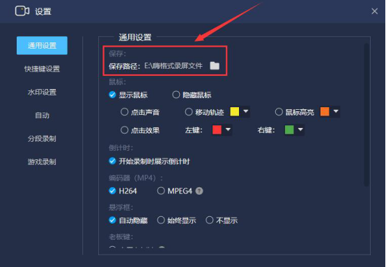 4.进入设置页面后,切换至通用设置页面,自定义嗨格式录屏大师摄像头录制的视频保存路径,要注意不要放在空间少的磁盘,以免空间不足导致录制失败。