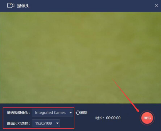5.接下来,在摄像头窗口中,我们选择摄像头和画面尺寸。如果摄像头一时间没显示出来,就点击刷新按钮多刷新两三遍便能识别摄像头了,再点击“REC”开始按钮。嗨格式录屏大师的摄像头模式便开始录制视频了。