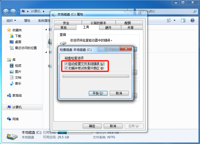 如图,确认检查选项,勾选【自动修复文件系统错误】和【扫描并尝试恢复坏扇区】,点击开始,