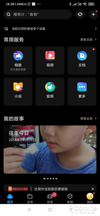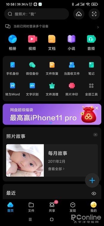 百度网盘 11 的首页进行了改动,常用服务按钮图标缩小,空出的位置留给了工具栏,这里有着百度网盘附带的小工具。工具栏里的小工具时可以定制显示的,用户可以将自己常用的工具放到这里方便快速打开。