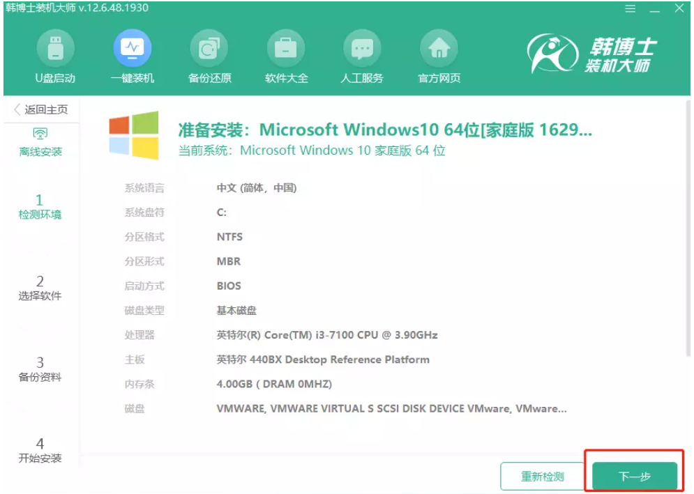 如图,进行离线安装缓解,首先检测环境,勾选常用装机软件,备份重要文件,然后点击【开始安装】,