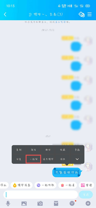 2、然后长按“大家在做什么”这个消息,菜单中选择【一起写】;