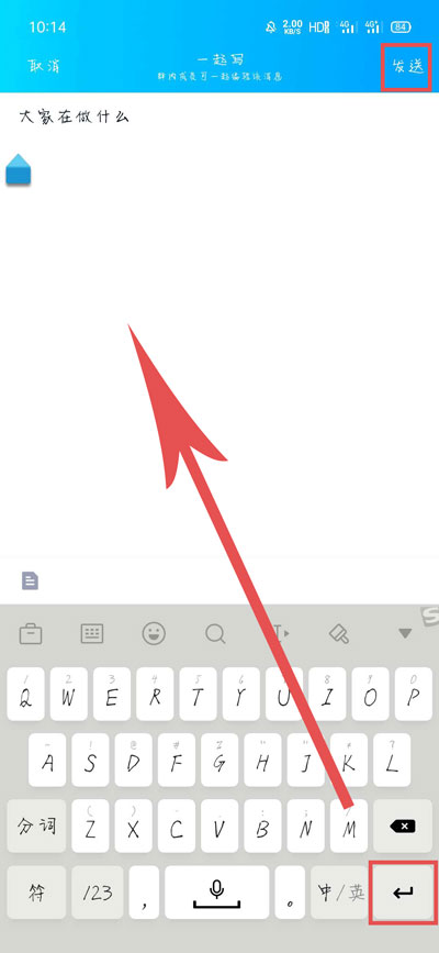 3、接着会自动跳转到一起写页面,在输入框中使用键盘的【回车键】换行,输入你想要写的内容,点击【发送】;
