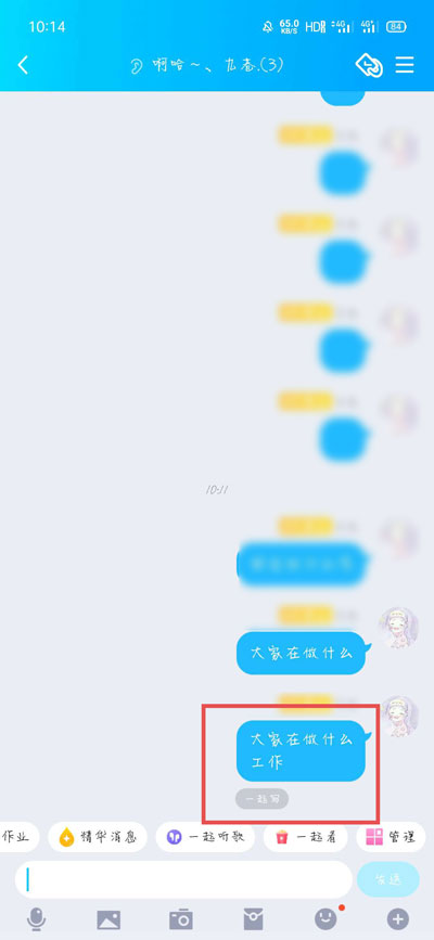 1、首先打开一个QQ群聊,首先我们需要发送一个一起写的主要内容,也可以由其他成员发送,例如:大家在做什么;