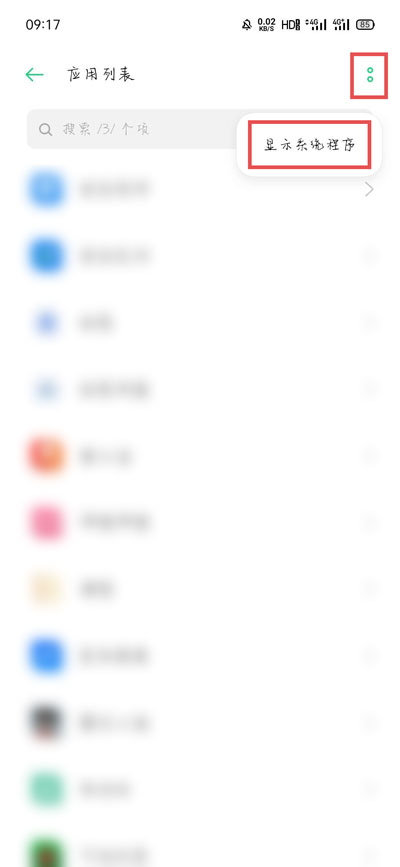 3、之后也可以看到手机所有的应用程序,点击右上角的两个点,选择【显示系统程序】;