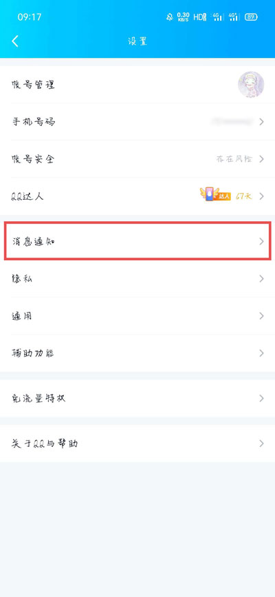 3、进入QQ设置页面后,选择【消息通知】设置;
