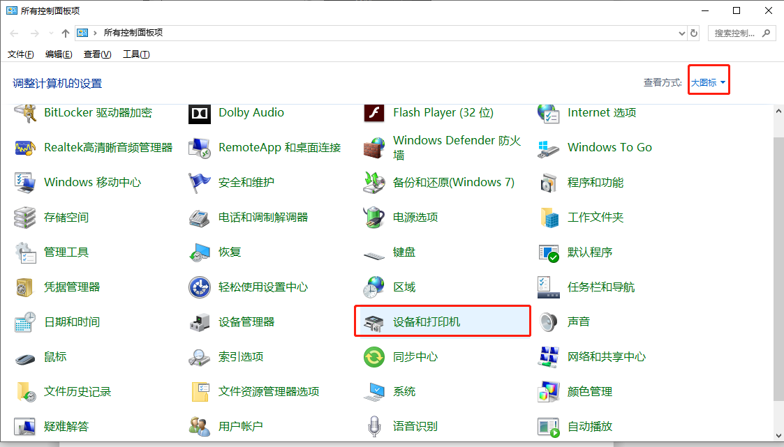点击进入控制面板,设置【查看方式】为大图标,然后点击【设备和打印机】,