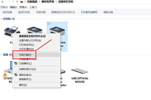 进入以下界面,选择当前所使用的扫描仪或者打印机,右键点击选择【开始扫描】,