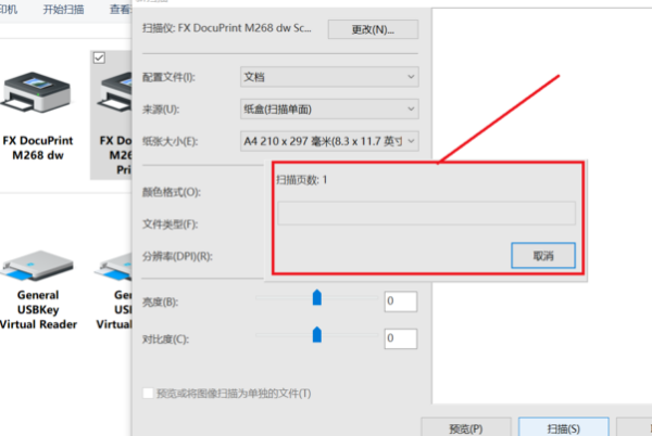 弹出对话框,如图,进行扫描文件的相关设置,例如纸张大小、文件类型以及分辨率等,接着点击【扫描】,耐心等待扫描完成,