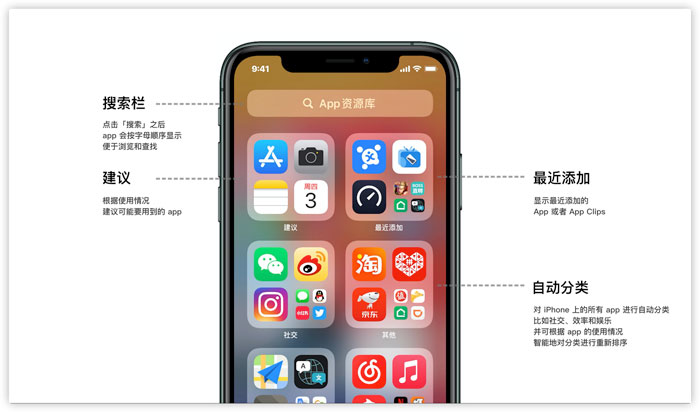 • “App 资源库”自动将您的所有 App 按类别整理
