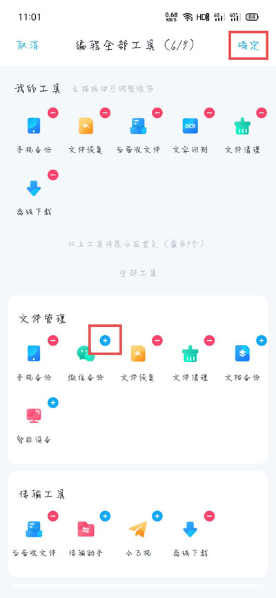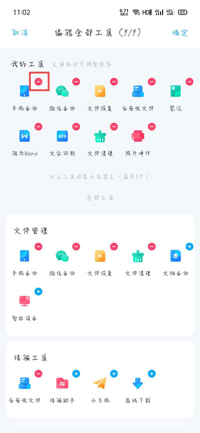 5、我的工具中最多可以显示9个工具,每个工具可以长按移动更换位置,最后只需要点击右上角【确定】保存即可。