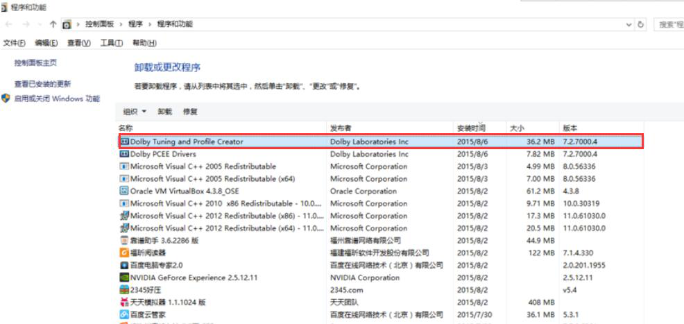 8、Win10成功安装杜比音效驱动后,我们可以回到“程序和功能”页面,便可以看到杜比音效的声卡驱动了,如下图。