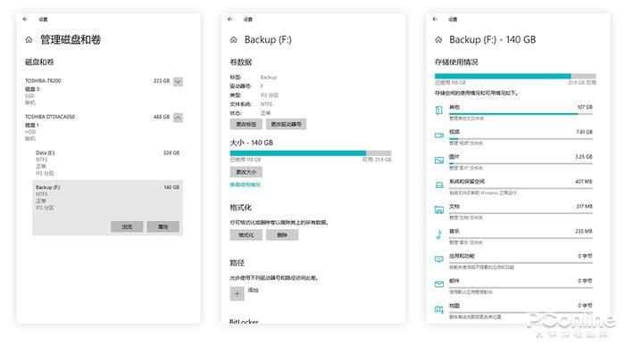 新版 Win10 将 “磁盘管理”转为 UWP 模式,可以通过 “系统”→“存储”→“管理磁盘和卷”打开它。和旧版相比,新磁盘管理在基础功能方面已经十分完善,包括更改驱动器号、更改卷标、分区格式化、Bitlocker、存储浏览、大小调整(卷压缩)等在内的常规功能,均已能正常使用,不过像动态磁盘、MBR 分区激活等少数高级功能还未加入。此外新版在直观性方面并不及旧版,这一点也是需要后期加强的。
