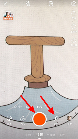 进入视频拍摄窗口,如图,选择音乐,点击红色按钮,即可录制视频,