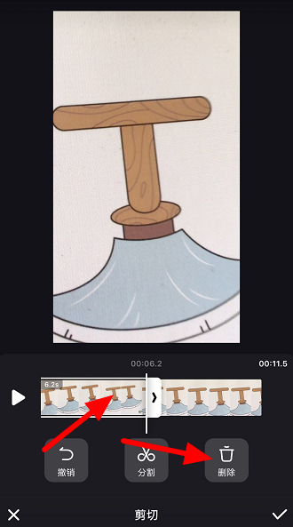选中需要删除的视频片断,点击【删除】,再点击对勾,继续下一步操作,