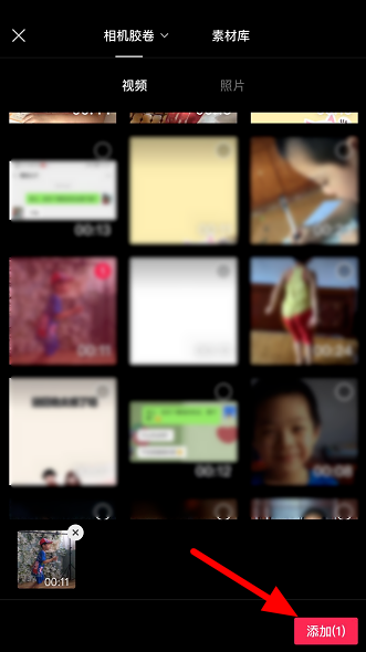 进入手机相册,选择视频素材,点击【添加】,