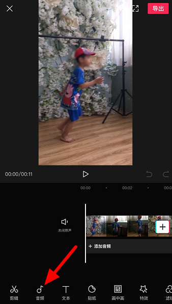 视频导入成功,进入剪辑窗口,滑动下方工具栏,点击【音频】,然后选择【音乐】,